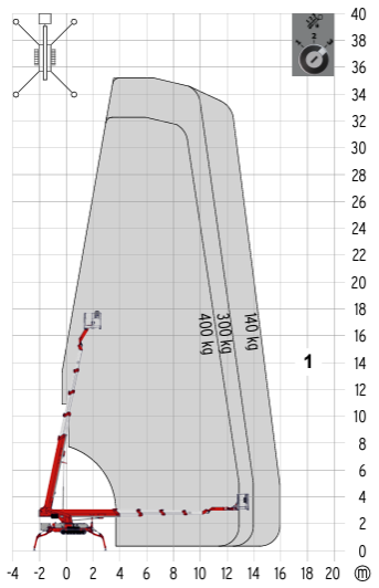 Teupen 35T+ Edderkoplift tilbyder en arbejdshøjde på 35 m og en maksimal horisontal rækkevidde på 16 m. Den maksimale løftekapacitet for denne Teupen er 400 kg. Maskinen kører på diesel, men er samtidig udstyret med en 230V el-motor, som gør det muligt at anvende liften på ren el når den er sat op til brug.